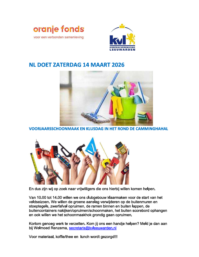 KVL gaat met behulp van sponsoring van het Oranje Fonds NL Doet (Landelijke schoonmaakdag) zaterdag 14 maart (10.00 - 14.00 uur) aan de slag in en rond de Camminghahal.